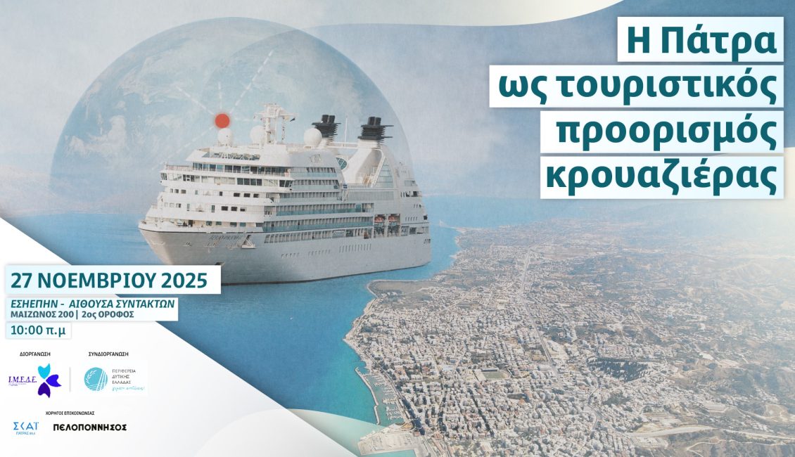 Στο πλαίσιο των δράσεων του Ι.Μ.Ε.Δ.Ε. για την ανάδειξη και ανάπτυξη στρατηγικών τομέων της τοπικής οικονομίας και κοινωνίας πραγματοποιείται στις 27 Νοεμβρίου 2025 στην αίθουσα της ΕΣΗΕΠΗΝ συνέδριο με τίτλο «Η Πάτρα ως τουριστικός προορισμός κρουαζιέρας».
