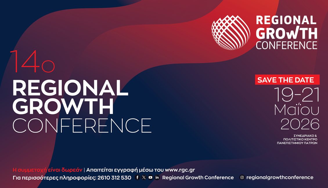 Το 14ο Regional Growth Conference (RGC 2026) θα πραγματοποιηθεί από τις 19 έως τις 21 Μαΐου 2026, στο Συνεδριακό & Πολιτιστικό Κέντρο του Πανεπιστημίου Πατρών, επιβεβαιώνοντας τον ρόλο του ως κορυφαίας πλατφόρμας δημόσιου διαλόγου για την περιφερειακή ανάπτυξη στην Ελλάδα.